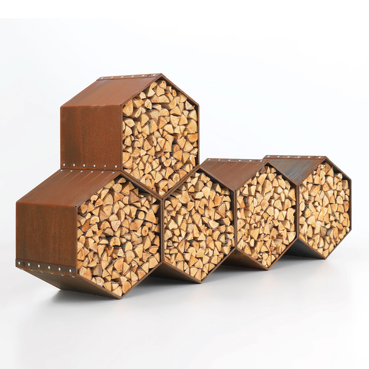 • Holzlager-Systeme wie WoodBee Wall – dekorativ und funktional zur Lagerung von Brennholz, teilweise aus Cortenstahl gefertigt.
